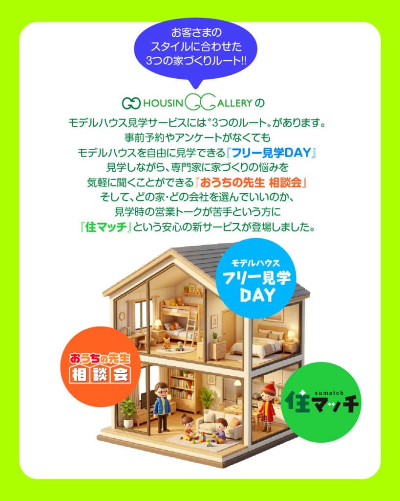 2026年1月よりモデルハウスフリー見学DAYの開催日に『住マッチ』を設置します。これは、ご来場いただいたお客様が最短ルートで“理想の住まい”にたどり着けるよう、中立な立場でサポートする新サービスです。「自分に合うモデルハウスがわからない」「営業トークを聞くのが苦手」など、迷いや不安があるときは『住マッチ』をご利用ください。ご予約優先ですが、当日でも空きがあればご案内いたします。