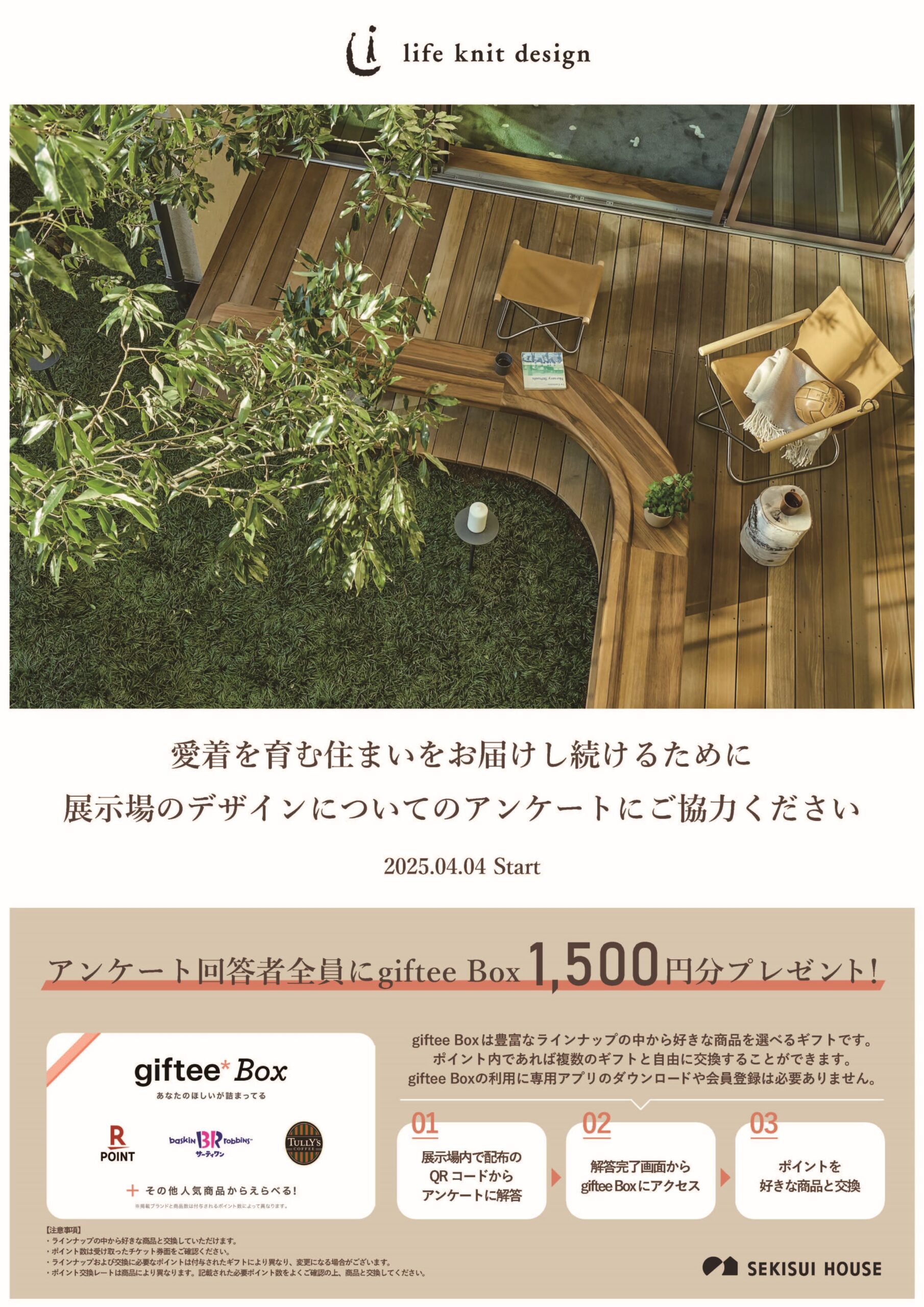 展示場にご来場頂き、アンケートに答えていただいた方には、楽天ポイント、TULLY'S COFFEE等、豊富な種類のギフトと交換できるgiftee Box1500円分をプレゼントいたします。