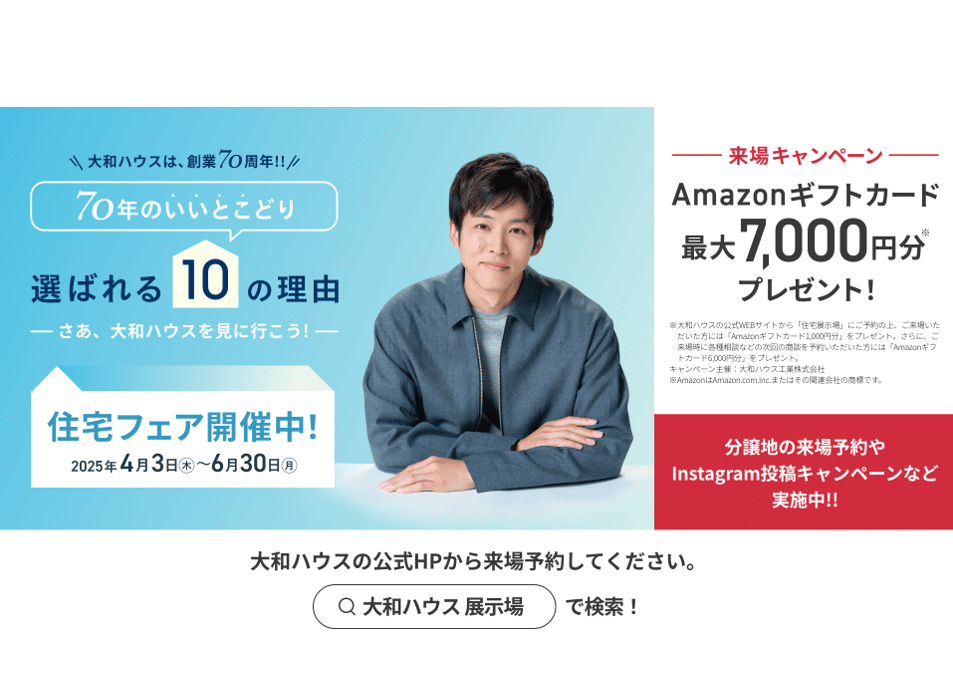 2025年4月3日~6月30日の期間中、大和ハウスの公式WEBサイトから「住宅展示場」にご予約の上、ご来場いただいた方には「Amazonギフトカード1,000円分」をプレゼント。さらにご来場時に、各種相談(土地探し相談、建物見学、資金計画相談、土地の敷地調査、物件見学など)の次回の商談を予約いただいた方には、「Amazonギフトカード6,000円分」をプレゼントします。展示場にて当社営業担当者が専用のプレゼント応募用フォームをご案内しますので、Amazonギフトカード送信用の情報を登録していただきます。※詳しくは当社ホームページをご覧ください。